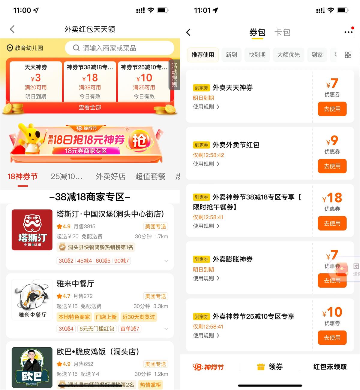 美团扫码->直接领取->今天11、14、17、21点可各领取一张38减18元券->神券只限今天使用->今天刚好要点外卖的可以领一下!