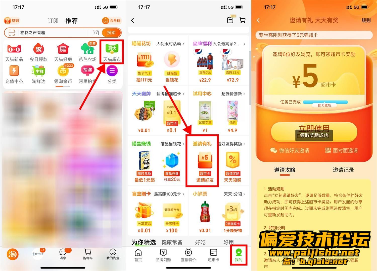 淘宝APP首页“天猫超市”->菜单栏“我的”->进入“邀请有礼”->邀请6人助力领取5元天猫超市卡,每日可参与一次,被邀请人每5天可助力一下