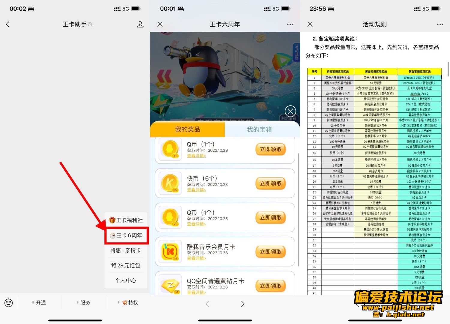 微信关注公众号“王卡助手”->菜单栏“王卡6周年”->简单浏览得宝箱->直接开宝箱抽实物/Q币/会员/话费/浏流量