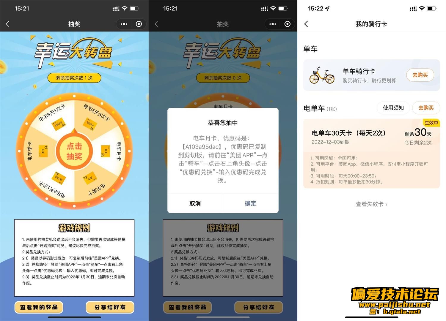 微信打开地址->选择单车或电车->答对5题抽最高季卡兑换码->在“美团APP-骑车-右上角头像-优惠券”中粘贴兑换码兑换