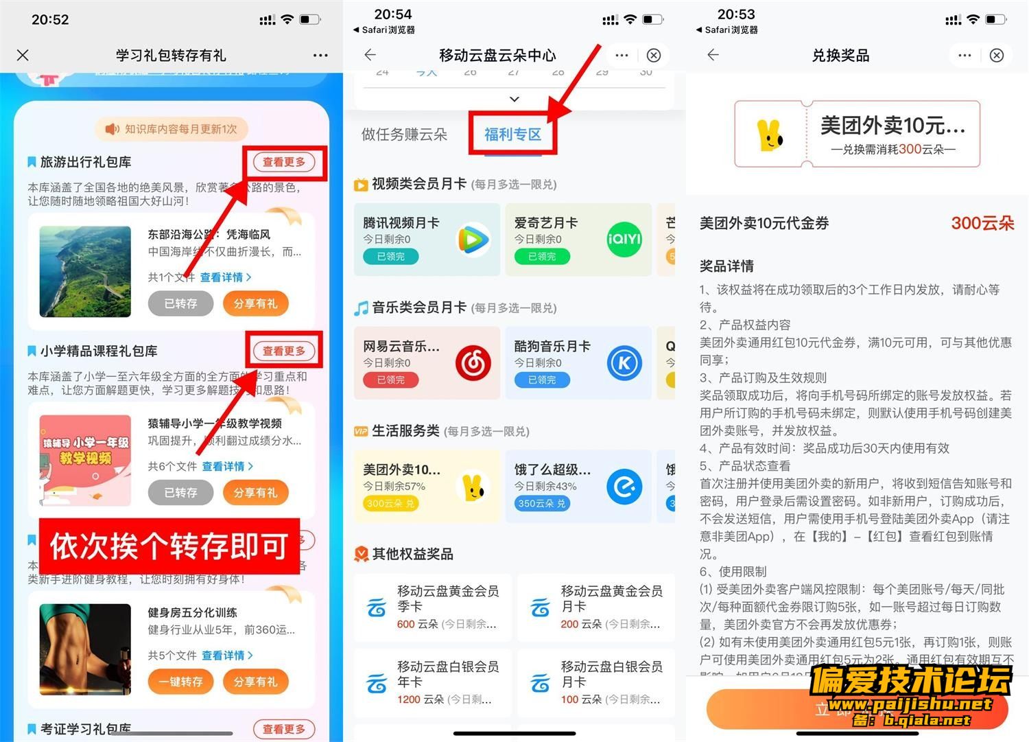 1、打开地址->查看更多->一键转存10次领100云朵->中国移动云盘APP->右上角“签到”