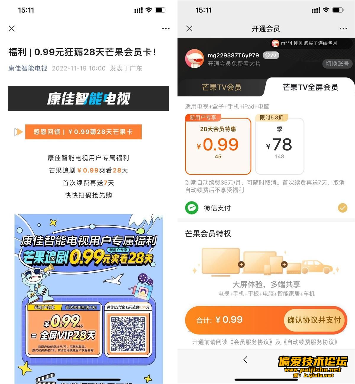 微信打开地址->扫码进入活动->芒果TV新用户1元开全屏会员28天,全屏会员在手机、平板、电视均可使用