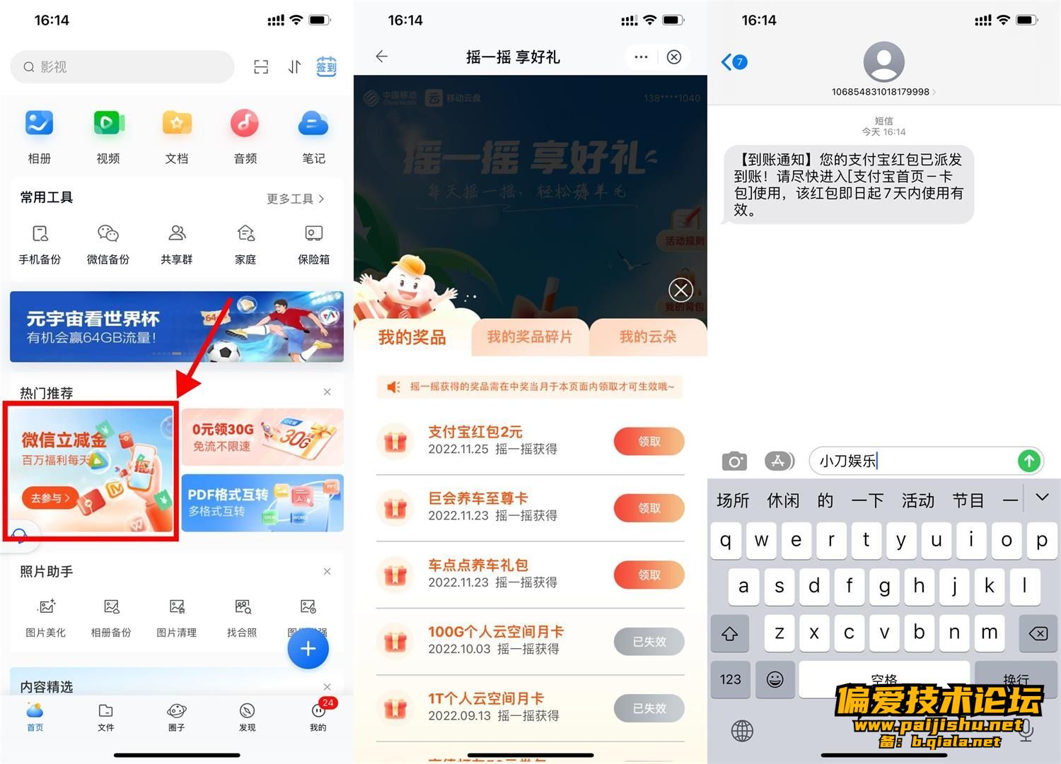 移动云盘APP最新版->首页横幅进入->每天摇一摇抽支付宝红包、微信立减金、视频会员等