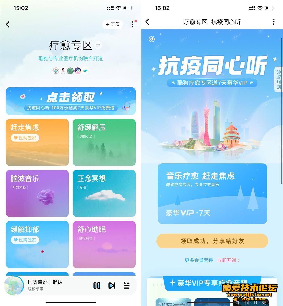 酷狗音乐APP搜索“疗愈专区”->横幅同心听进入->直接领取7天会员