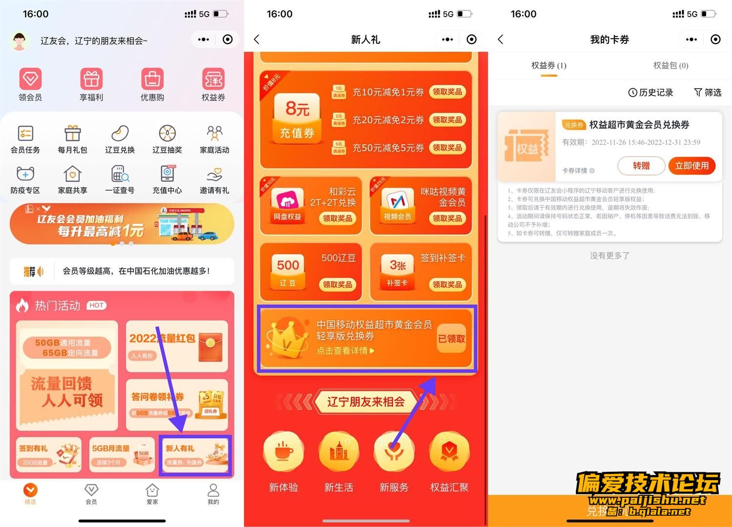 微信进入小程序“辽友会”->新人有礼->下拉领取超市权益黄金会员->返回小程序我的卡券中兑换->每个月可免费领取5元天猫超市卡