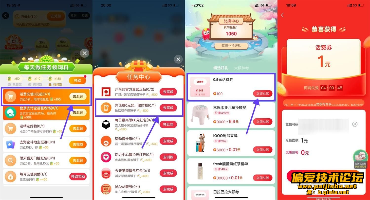 1、淘宝首页“充值中心”->薅羊毛赚话费->领饲料->先把其他任务做了就会显示“话费0元起”0充1元话费