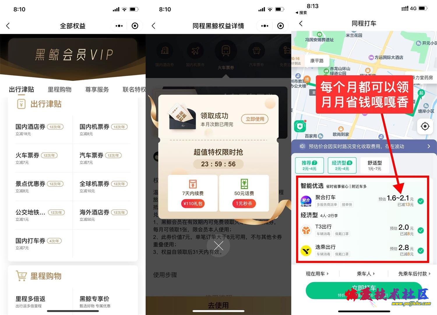 2、开通后立得20元无门槛打车/火车/酒店券 3选1!更多详细权益进去后下拉到底点黑鲸会员协议查看!各种出行优惠刚需还挺不错的!