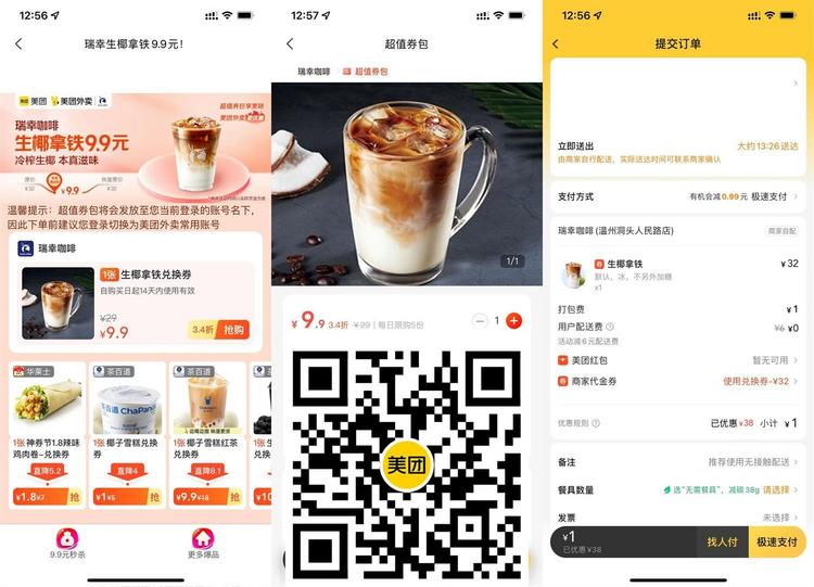 打开地址或美团扫码->9.9元购瑞幸生椰拿铁兑换券,直接点外卖就可用的!券有效期14天 每日限购5张,喜欢喝瑞幸的可以屯几张