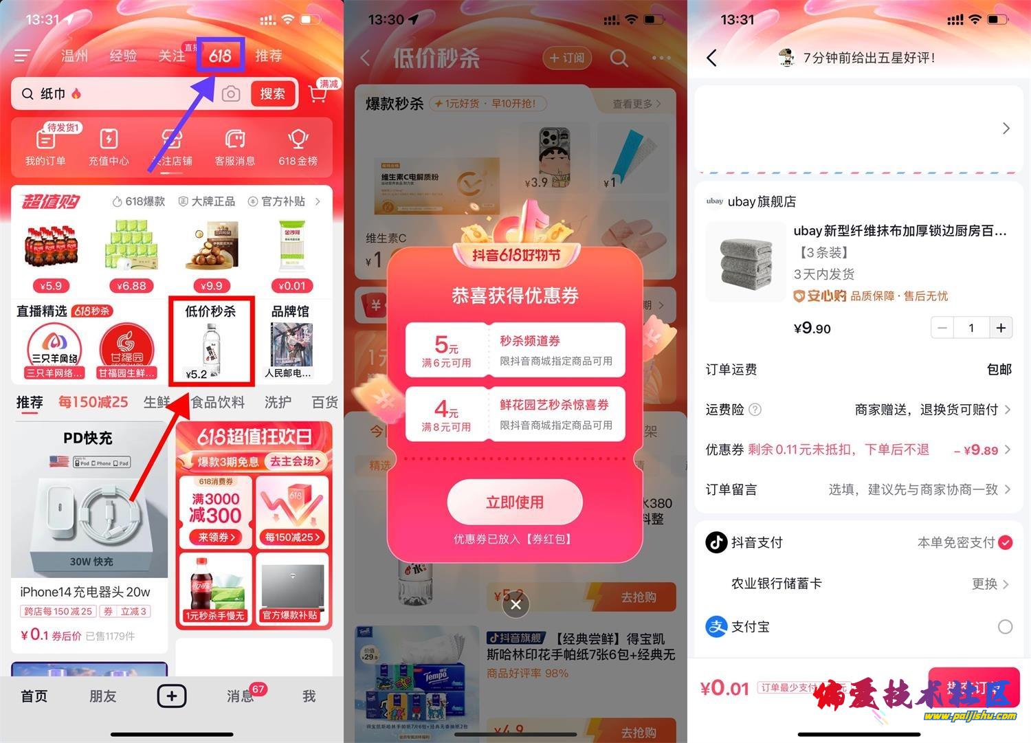 抖音APP顶部“商城/购物/618”->低价秒x->弹出5元无门槛券->下拉找到0.01元左右的实物购买即可