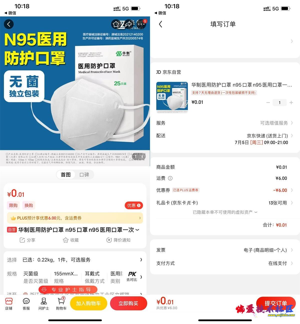 京东APP扫码->使用PLUS运费券+0.01亓即可到手25只口罩