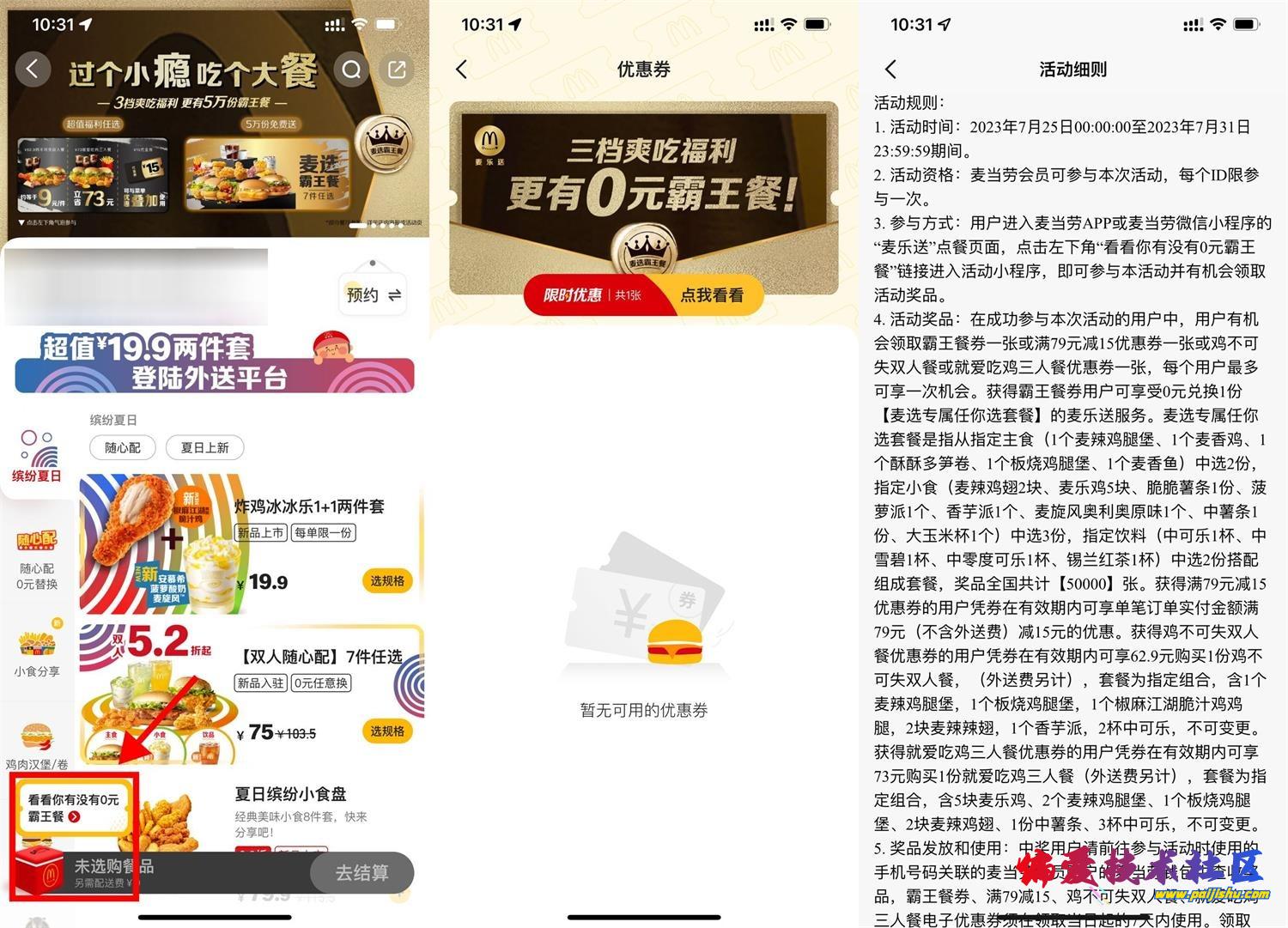 麦当劳小程序或APP->进入麦乐送->点左下角购物袋抽0元霸王餐,抽中霸王餐直接免/费吃+免配送费(满减券或者其他券都没啥用)