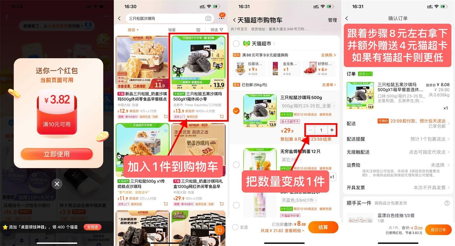 2、红包点“立即使用”搜索“三只松鼠沙琪玛”加入13.9元的到购物车