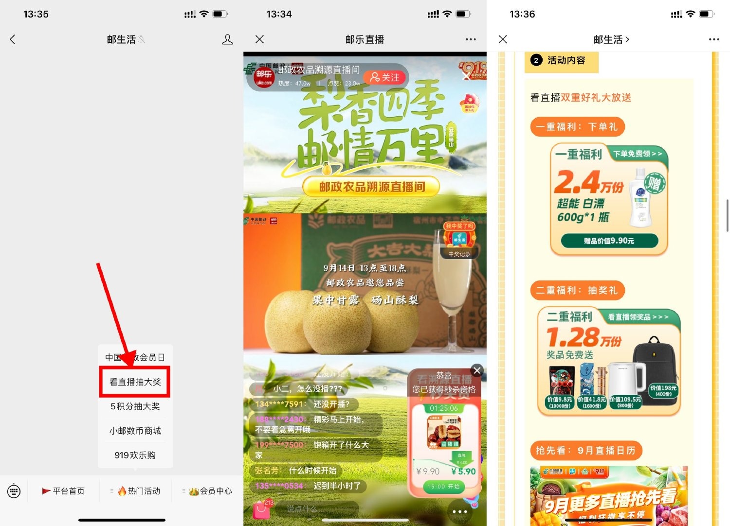 微信关注公众号“邮生活”->菜单栏“热门活动-看直播”->进入直播间后每30分钟有抽奖,抽中就是0元包邮到手实物