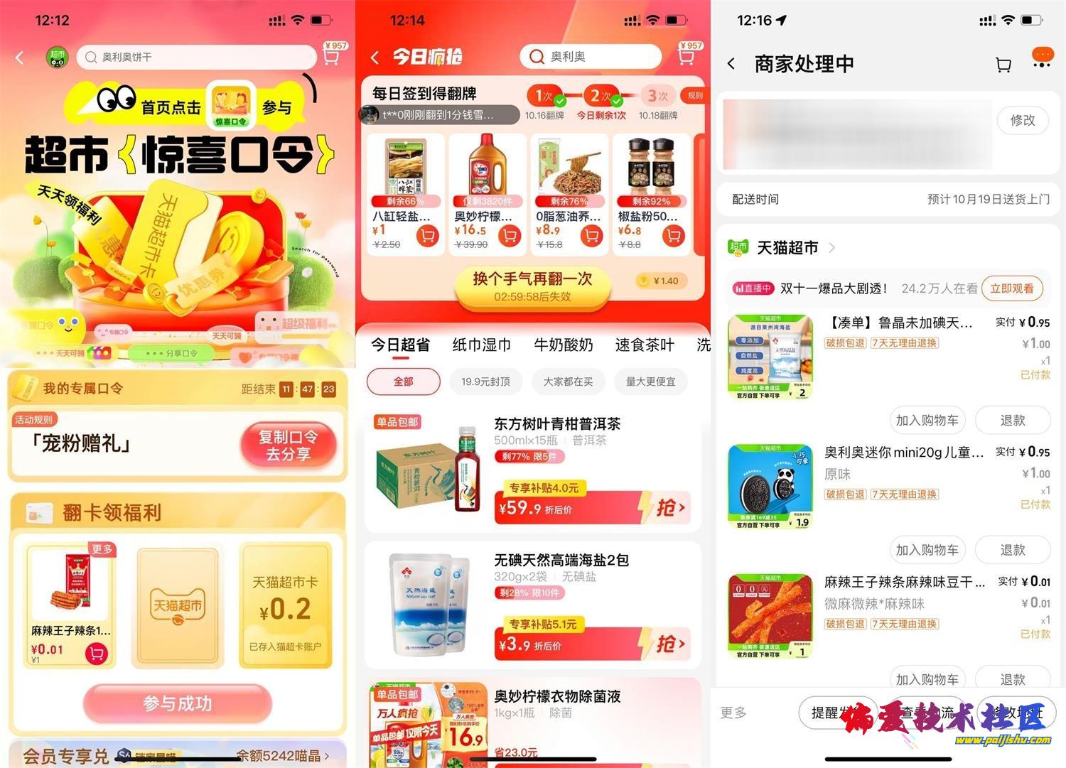 2、天猫超市首页“今日疯抢”翻牌看看有没有0.01~1亓实物,有的话也加车