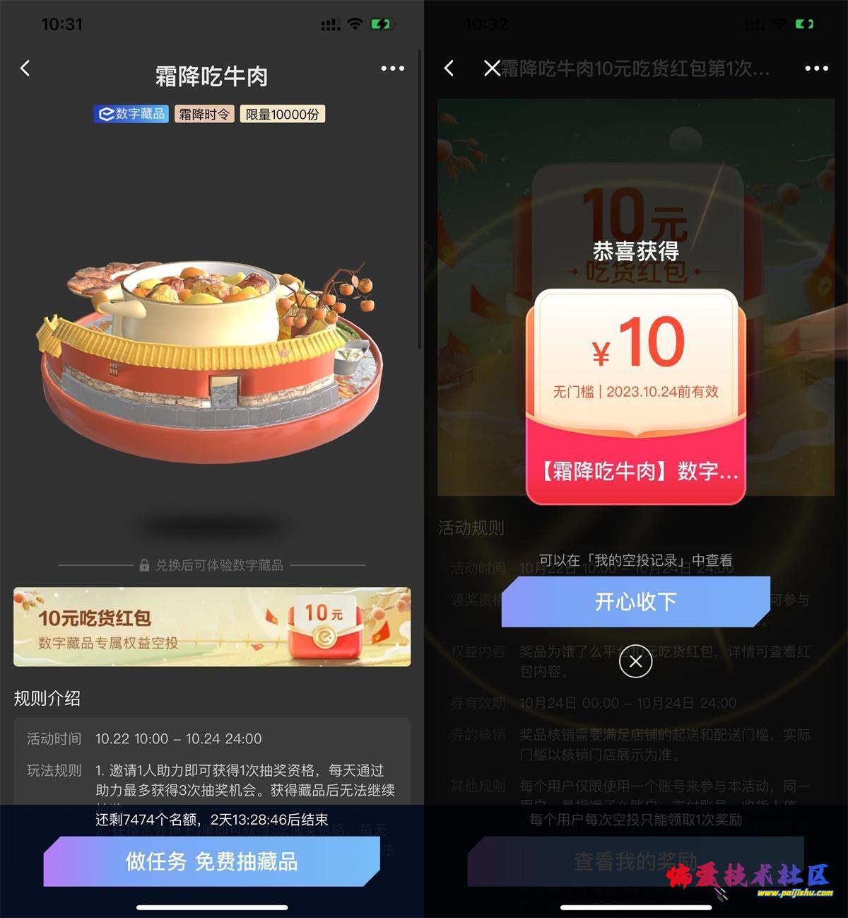饿了么APP扫码->霜降吃牛肉->邀请1~3位好友助力得抽奖次数->抽中数字藏品直接领10元无门槛外卖红包,限10月24日可用